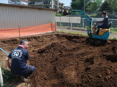 校庭の東側、新しい登り棒の近くのスペースを活用し、新たに田と畑をつくります。今日は、まず土を掘り起こす作業を行いました。土が固まっており、手作業では難しい状態でしたが、機械を持ってきていただけたので、大変助かりました。ありがとうございました。