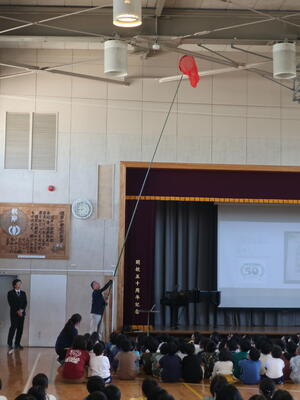 はじめに、校長先生からお話をいただき、50周年記念の映像をみんなで見ました。その後、清水さんにクイズ等を交えながらお話をいただきました。子供たちは、興味深そうに話を聞いていました。