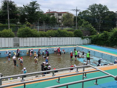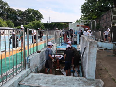 6年生の子供たちが協力しながら、プールの中やプールサイド等を清掃しました。泥や落ち葉が沈んで汚れていたプールは、見違えるようにきれいになりました。6年生の皆さん、ありがとうございました。来週から水泳学習が始まります。