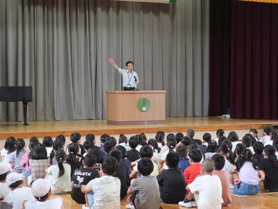 始めに、校長先生から、水泳の学習に一人一人の目標をもって取り組むこと、きまりを守って安全に活動すること等についてお話をいただきました。