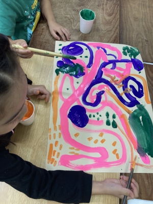 1年生の図工では、絵の具を使って協力して作品を作っています。