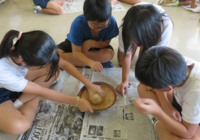 総合的な学習の時間に 学校で育ててきた稲を収穫し、もみすりをしました。