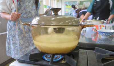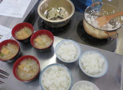 調理実習では、米を炊き、煮干しからだしをとって作った みそ汁と共に おいしくいただきました。