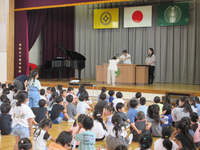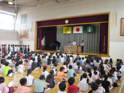 校長先生から、1学期を振り返り、心を込めたあいさつの大切さについてお話がありました。長い夏休みに、一人一人目標をもって継続して取り組むことについてもお話しいただきました。また、夏休みを安全に過ごすために気をつけなければならない「5つの車」についても話して、子供たちに注意喚起しました。