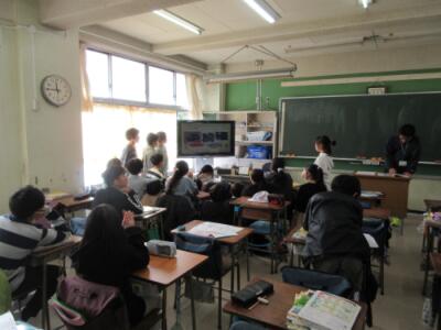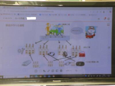 5年生の社会の学習ですが、教室のテレビにみんなが集まって画面を見ていました。見ると、5年生が自分でつくったスライドを用いて、社会で学んだことや考えたこと、調べたこと等をまとめて発表しているようでした。こちらは、「ミライシード」というアプリケーションソフトに入っている、「オクリンクプラス」という機能を活用したものです。撮った写真や入力した文字をカードにし、それらを自在につなぎああせて一つのプレゼンテーションのようにできるものです。ICT機器の活用が浸透し、日ごろから活用している姿が見られるようになってきました。これらの機器を「文房具」として用い、さらに学びを深めています。